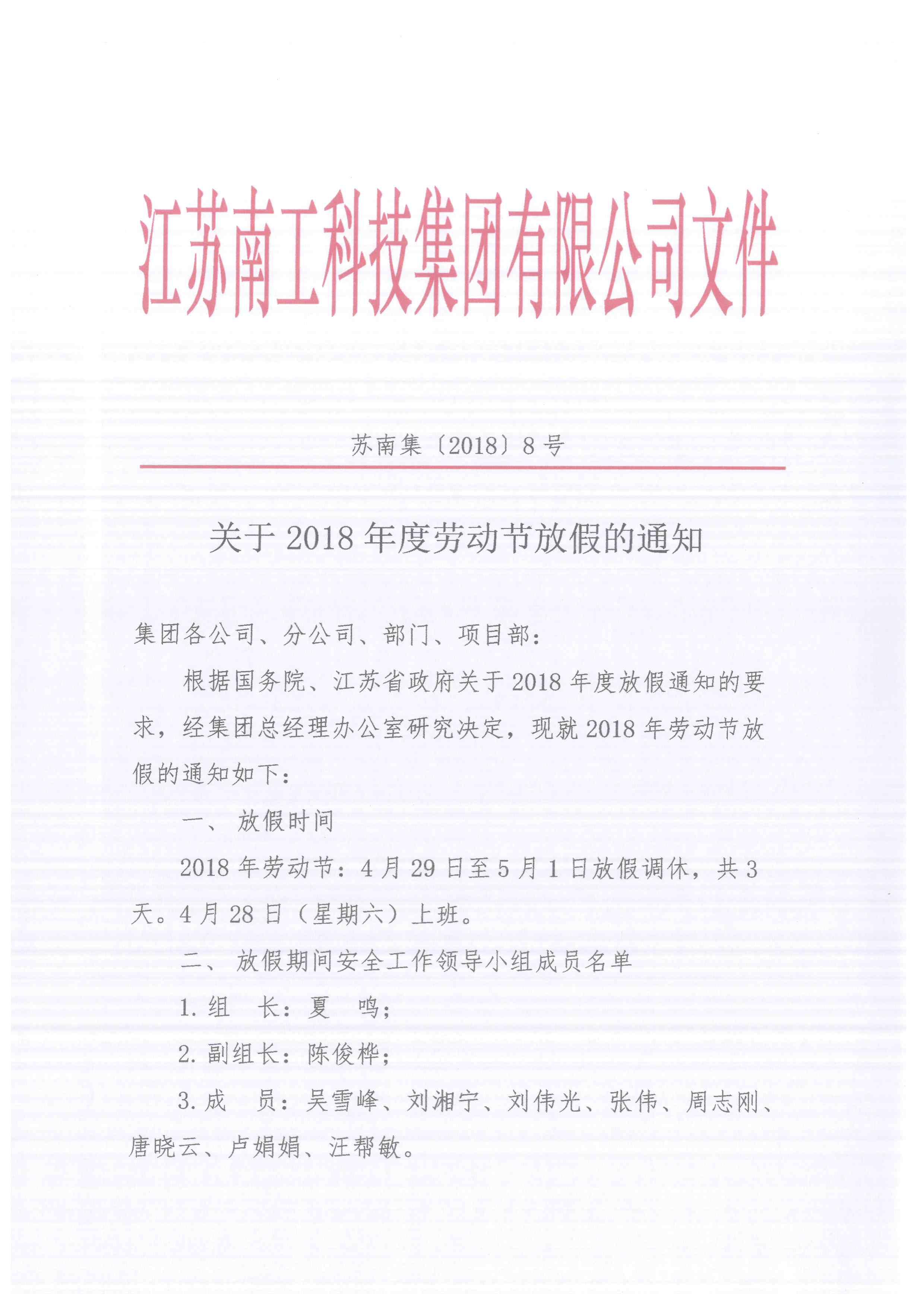 关于2018年度劳动节放假的通知
