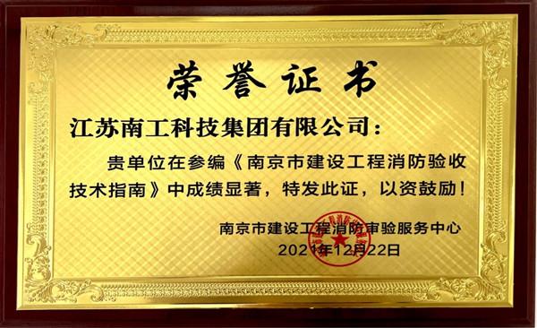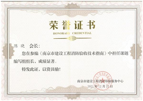 陈晓总经理作为编写组组长、宋慧作为编写组专家受到了南京市建设工程消防审验服务中心、江苏省安装行业协会等一致好评,并获得荣誉证书。