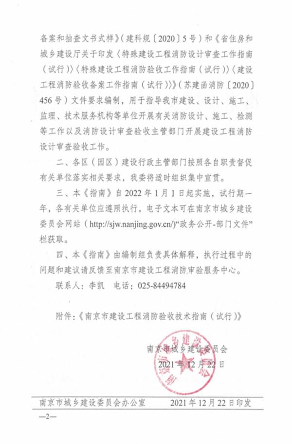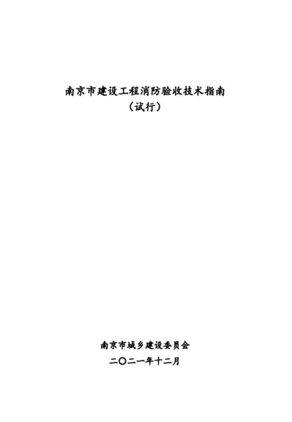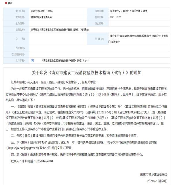 12月22日,南京市城乡建设委员会正式发布《南京市建设工程消防验收技术指南》,从2022年1月1日起开始试行。