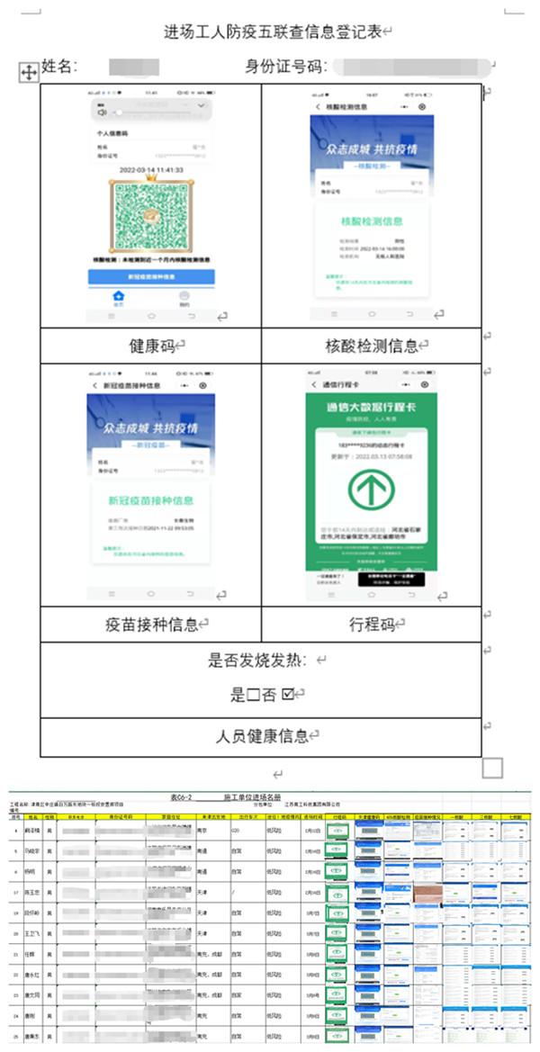 严格落实疫情防控要求,新入场人员一人一档,一三七三次核算检测结果阴性方可从临时观察区转入集体宿舍,方可进入工地施工。建筑工人实名制通道处和生活区分别设立体温监测点,对所有施工现场人员进行体温检测和“健康码”查验,核对人员身份和健康状况。